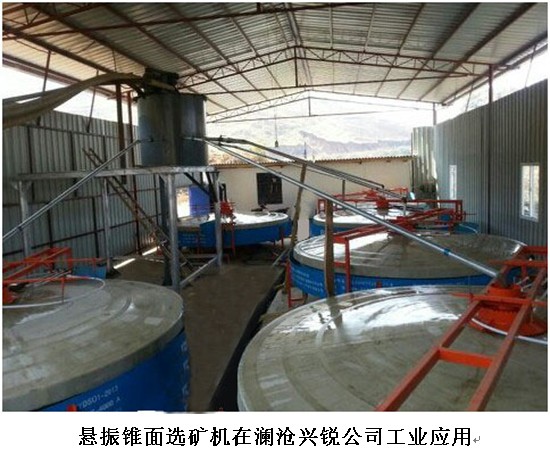 懸振錐面選礦機(jī)”是依據(jù)拜格諾剪切松散理論和流膜選礦原理研制而成的新型微細(xì)粒重選設(shè)備。當(dāng)攪拌均勻的礦漿從分選錐面的給礦器進(jìn)入盤面初選區(qū)時(shí),礦漿流即成扇形鋪展開向周邊流動(dòng),在其流動(dòng)過程中流膜由厚逐漸變薄,流速也隨之逐漸降低。